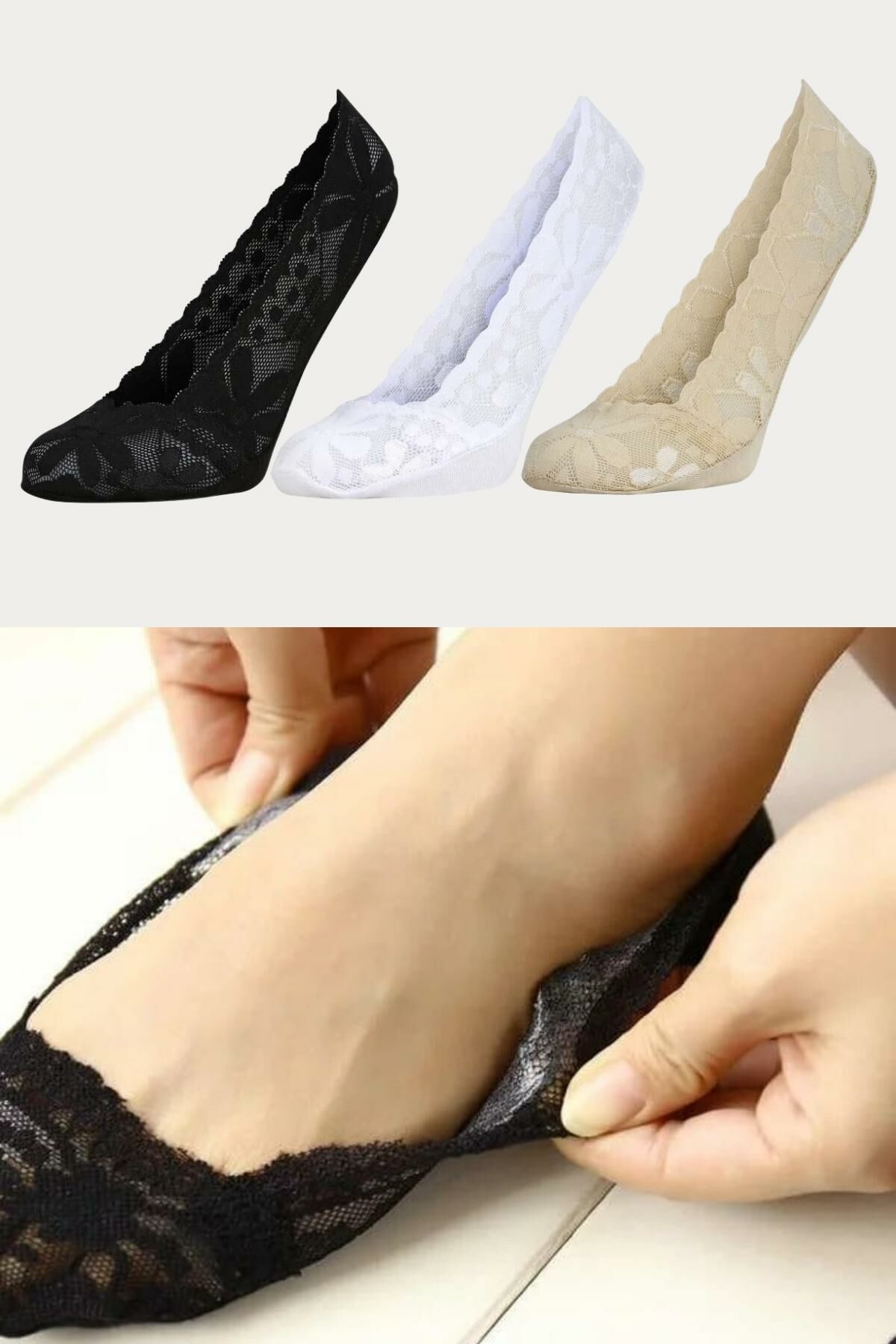 Kaydırmaz silikon bantlı, pamuklu ve görünmez dantel babet çorap.